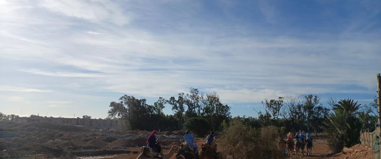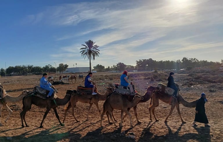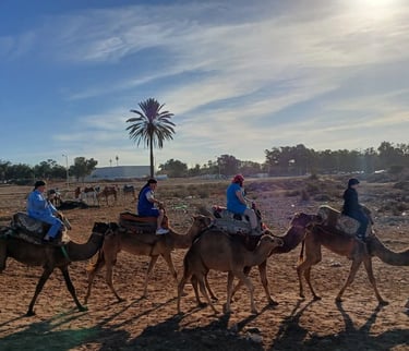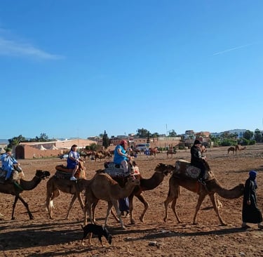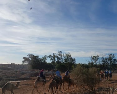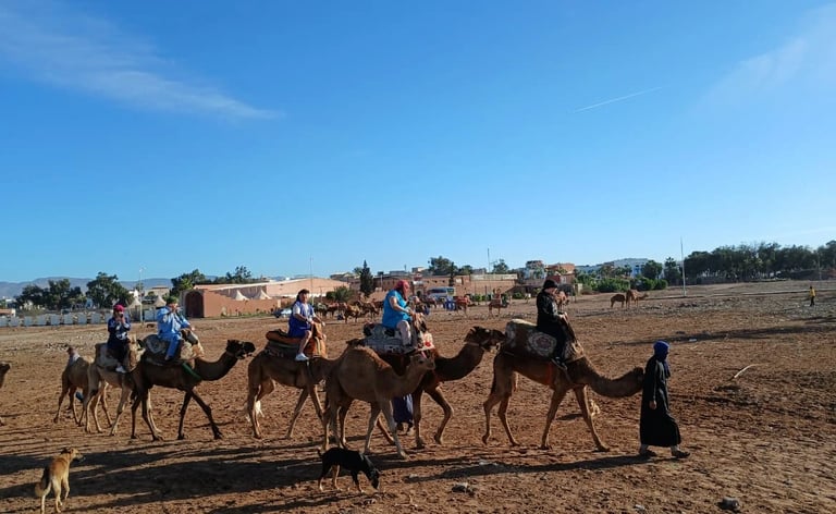 Upon arrival, the camel guide will introduce you to your domestic and friendly camel and provide a briefing on the ride. As you embark on your camel, you will pass through the village of Aghroud Bensergao and a serene eucalyptus forest. Upon reaching the mouth of the river Souss, you will pause to capture some photos and potentially spot migratory birds, including pink flamingos depending on whether the tide is high or low. Finally, bask in the breathtaking golden sunset while your guide captures these moments on your smartphone or camera. Upon returning to the ranch, indulge in mint tea and Moroccan cakes as a delightful end to your adventure.